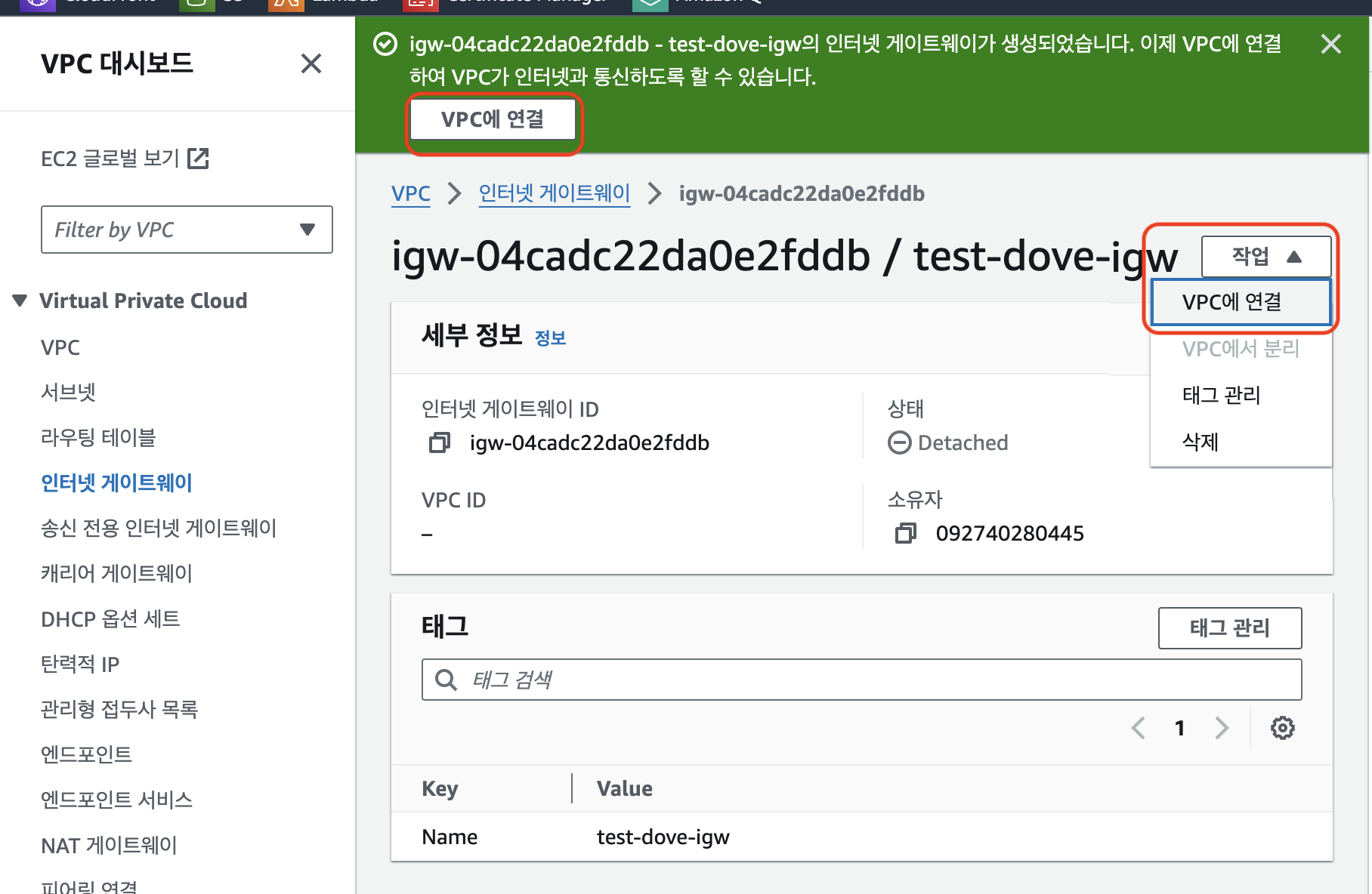 4. 앞서 만든 VPC 선택 후 인터넷 게이트웨이 연결