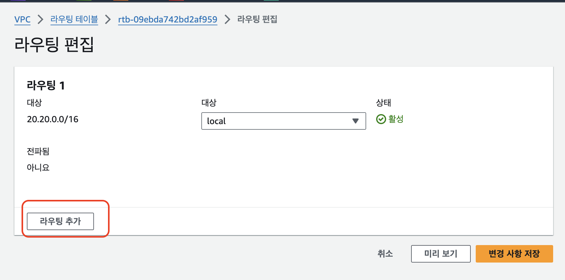 6. 라우팅 추가 클릭 후 라우팅 정보 입력 후 변경 사항 저장 클릭