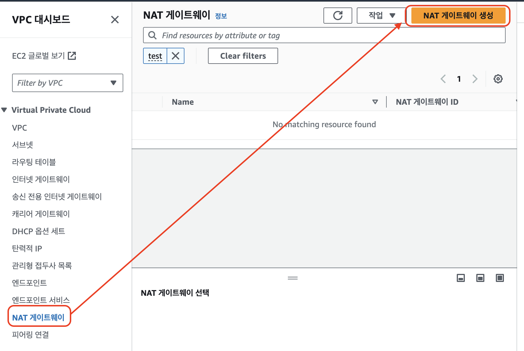 1. VPC 서비스에서 Virtual Private Cloud > NAT 게이트웨이 > NAT 게이트웨이 생 클릭