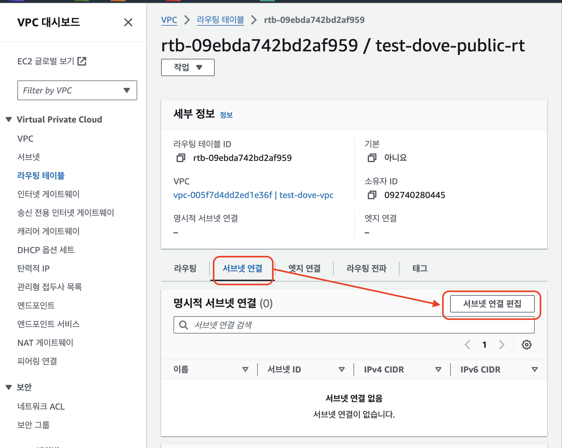 5. VPC 서비스에서 Virtual Private Cloud > 라우팅 테이블 > 앞서 만든 퍼블릭 서브넷용 라우팅 테이블 ID 클릭