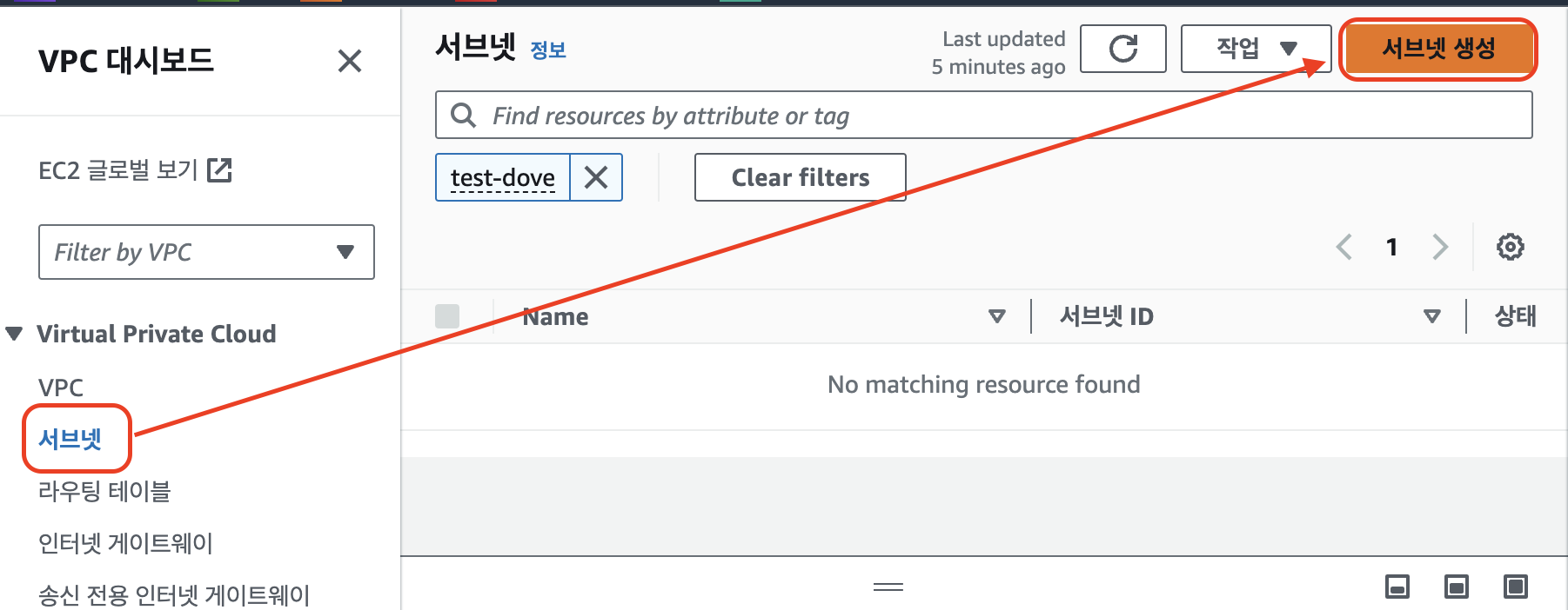 1. VPC 서비스에서 Virtual Private Cloud > 서브넷 > 서브넷 생성 클릭
