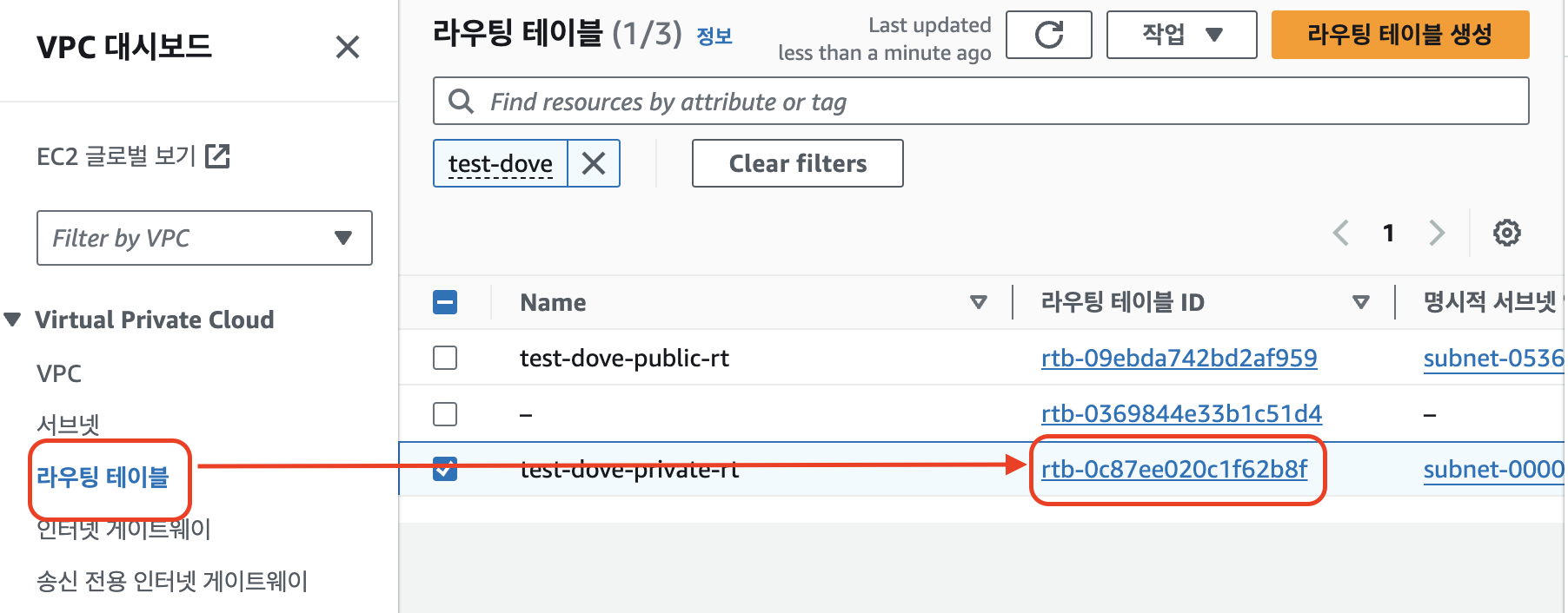 3. 만들어진 라우팅 테이블의 ID를 클릭한다.